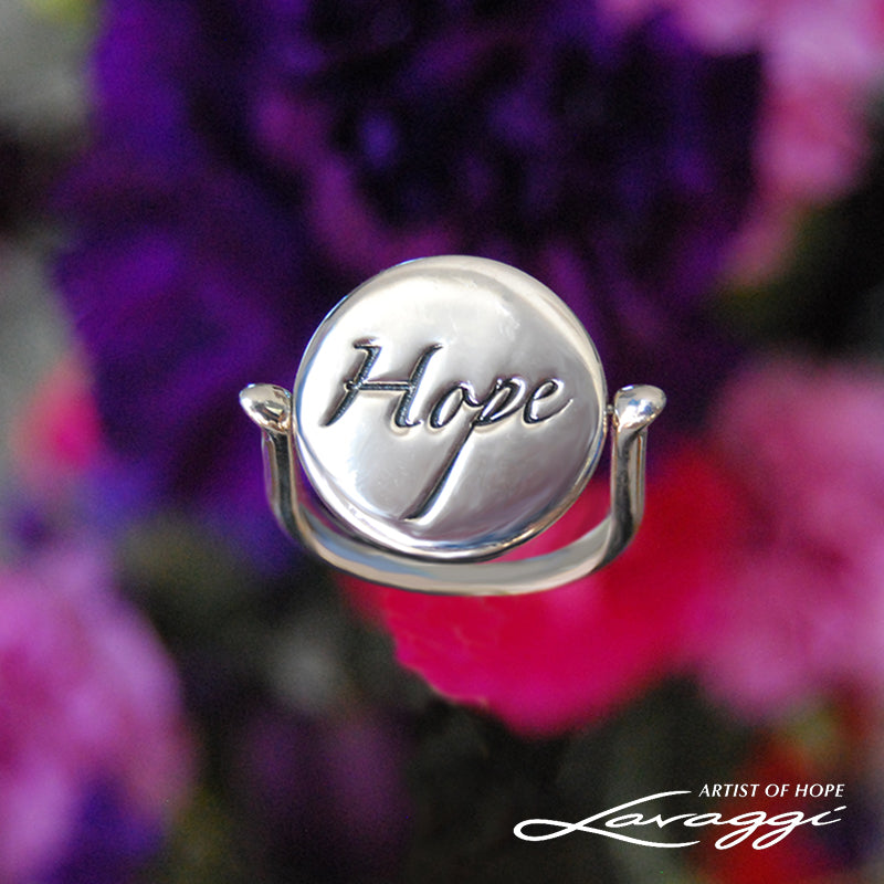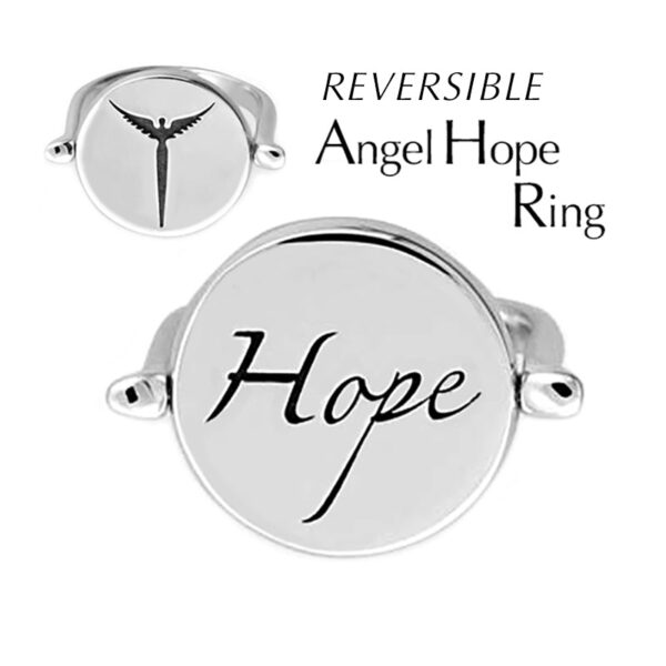 This reversible ring features the beautifully inscribed word Hope with the Lavaggi angel on the reverse side. Simply spin the disc to wear whichever side you want to see.Hope