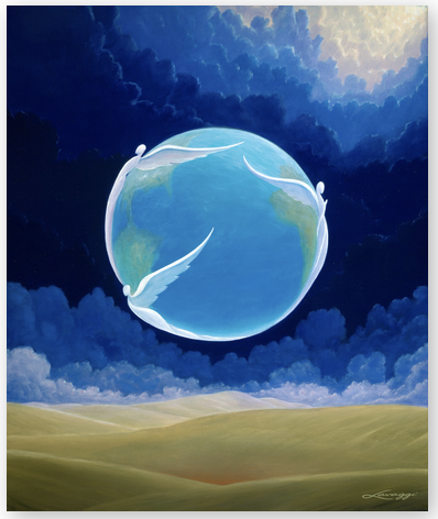 Our world is suspended in space, with the heavens opening above, as three Angels surround, embrace and protect this terrestrial ball that we call home. Standard size allows for easy framing. Hand Signed Lithograph, artist’s proof, limited edition. Printed on archival, acid-free paper. Made in the USA. Ships in a tube.