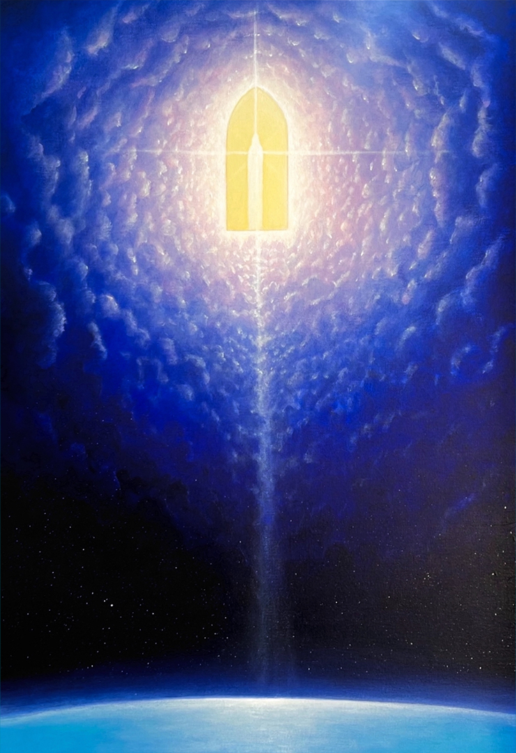 Christ stands at the doorway, the living gate between heaven and earth. From His heart, radiant light bursts forth in the form of the cross — a symbol of sacrifice, redemption, and divine authority. That light does not remain contained in heaven; it pours downward, spilling across the earth, reaching every searching heart.