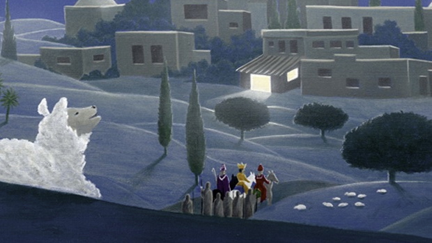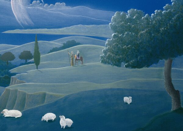 There is a glorious amount of imagery to discover on this small but impactful print: Mary on the donkey; the three wise men; the shepherds in the field; the manger; and even the cross leading to the glorified Christ. Hand signed lithograph ships in a stay-flat envelope.