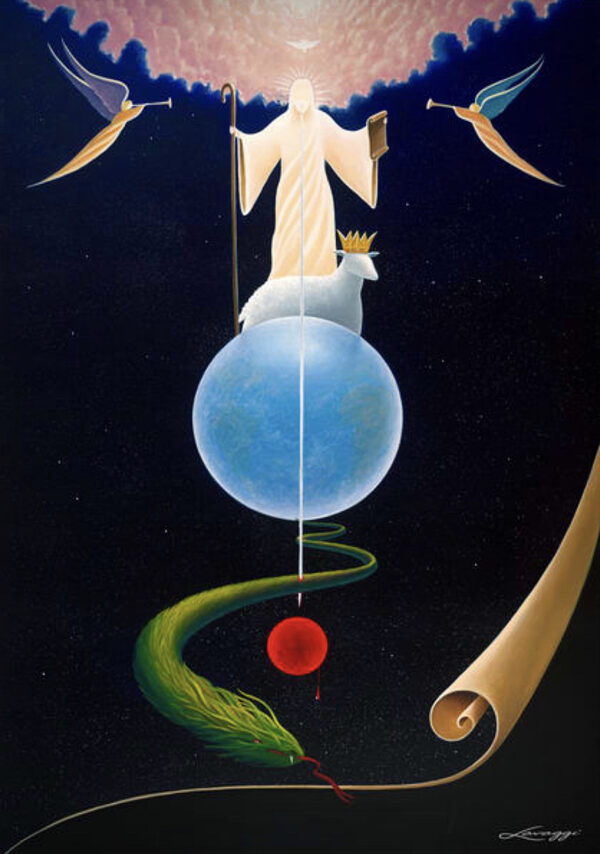 This painting is a scene from the Book of Revelation. The Lord is standing with the light of the Father above and the Holy Spirit Dove. The good shepherd holds the scroll that He alone could unseal with seven seals. The power of his breath is like a two edged sword that is piercing the evil one, symbolized as a dragon, as the moon turns to blood and the sky rolls up like a scroll. The Lamb overcame the dragon!