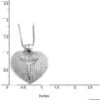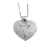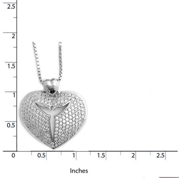 This puffed heart is covered with numerous simulated diamonds, highlighting a cut out silhouette of the popular Angel of Reconciliation by Lavaggi. Angels are generally unseen, so this is why the design has the Angel as a see-through figure. The puffed high polished heart shaped bale represents the heart of God watching over your heart!