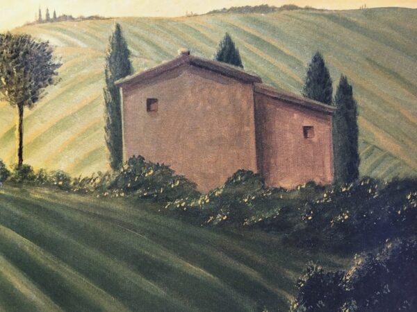Part of the Tuscan Series, this dreamy landscape invites you to enjoy the rolling hills of the vineyard as they lead you to the small villa that rests peacefully atop the hill. Hand Signed Lithograph, artist’s proof, limited edition. Printed on archival, acid-free paper. Made in the USA. Ships in a tube.