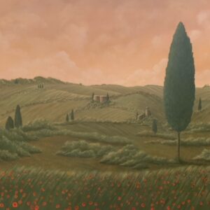 Part of the Tuscan Dreamscapes series, “Tuscan View” captures an idyllic Italian vista born from the artist’s imagination. A classic stucco villa set amongst rolling vineyard hills stretch into the distance as graceful Italian cypress trees punctuate the landscape like quiet guardians of time and tradition. Bathed in warm, amber light, the scene radiates a gentle sense of peace, romance, and timeless beauty.